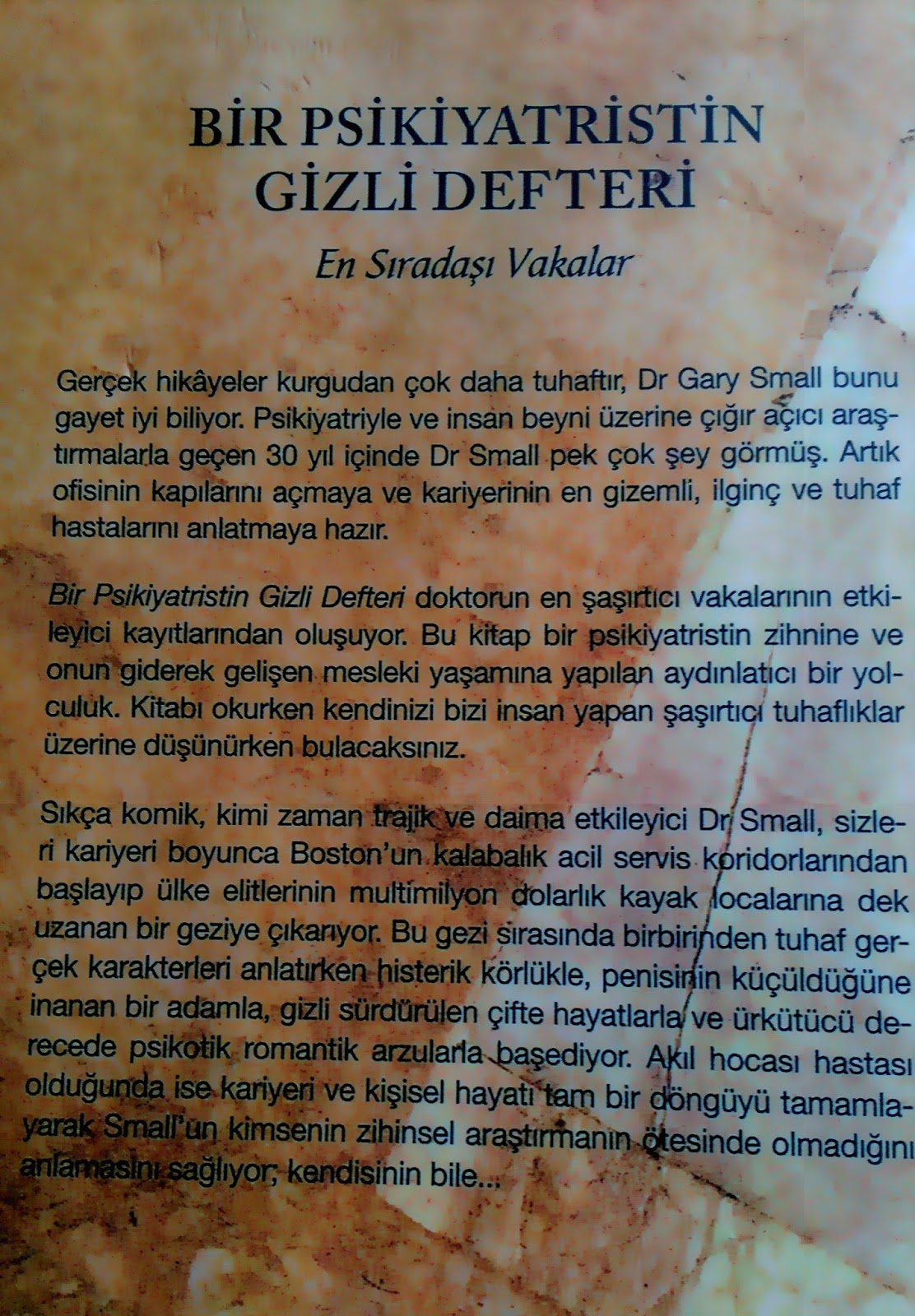 Akıl hastalıklarının ilginç dünyasına kapı aralayan bir psikiyatristin gizli defteri sizi çok şaşırtacak. Almadan önce fikir sahibi olun. Dary small okurlarına gerçek hikayelerden oluşan bir kitap sunuyor ve. Gary small un boston un kalabalık acil servis koridorlarından los angeles ın golf sahalarına uzanan hikâyesinde karşılaştığı vakalar kimi zaman tuhaf kimi zaman da gizemli ama hepsi gerçek.