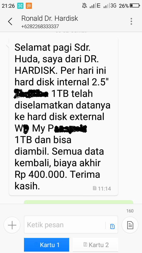 Untuk perbaikan berat harga diluar biaya sparepart yang paling gampang menghitungnya harga sparepart harga harddisk baru dengan tipe dan model yang sama sparepart bisa beli dari kami atau bisa beli sendiri. Mungkin tutorial yang akan saya sampaikan dibawah ini tidak sepenuhnya bisa dilakukan karena tergantung dari sisi kerusakan hardisk itu sendiri mungkin yang kebetulan yang saya coba ambil data hardisk milik teman saya ini adalah hardisk yang bisa dikatakan rusak karena. Saya punya hardisk external ini dokter dan maf jika saya menggngu ini masalah saya pada hardisk exterbal saya di bios terbaca dan disk meneger terbaca tp berubah jadi raw bkn jd nfts trus di my computer not responding lalu di dalam pembacaan ada suara krek itu dokter jd saya mau cara mengambilan datanya gmn jk gtu dokter jk hardisk saya gtu. Oh iya media penyimpanan baru ini tidak harus beli di dr.