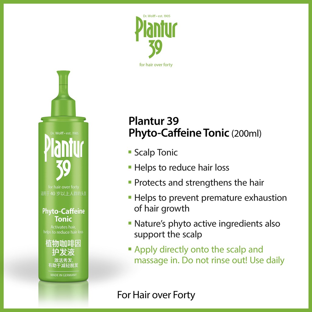 Dr wolff plantur 39. Adolf klenk the product range includes caffeine shampoo conditioner and tonic. The plantur 39 product range has been specially developed to meet the needs of hair over forty. 36 duxton hill 02 03 singapore 089614. Wolff research in collaboration with the dermatology department of the jena university clinic has developed a phyto caffeine complex an ingredient complex that promotes thicker stronger looking hair the secret behind the efficacy of plantur 39.